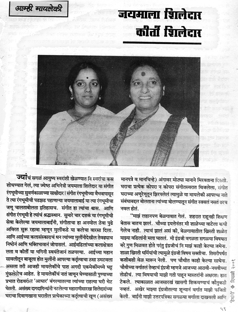 माराठी रंगभूमीच्या कार्यासंदर्भात महिती देणारे, रंगभूमीवरील कलाकरांच्या संगीतामधील योगदानाविषयी सतत वृत्तपत्रांमधून मासिकांमधून गौरवास्पद लेख प्रकाशित झाले आहेता, होत आहेत. शिलेदार कुटूंबियांचे विचार, मनोगत, त्यांच्या रंगभूमीवरील अवीट आठवणी यांचा खजिनाच या लेखांद्वारे रसिकांपर्यंत पोहोचत असतो. त्यापैकी काही सुंदर लेख येथे वाचकांसाठी उपलब्ध करून देत आहोत